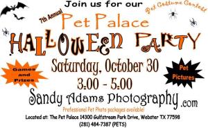 The Pet Palace is throwing a party! Their annual Halloween party complete with games and a costume contest. I will be there as the official photographer to take that special photograph of your adorable pup (or other pet). Mark your calendars for October 30th from 3 pm – 5 pm at The Pet Palace located just off I-45 (Dixie Farm Road exit).