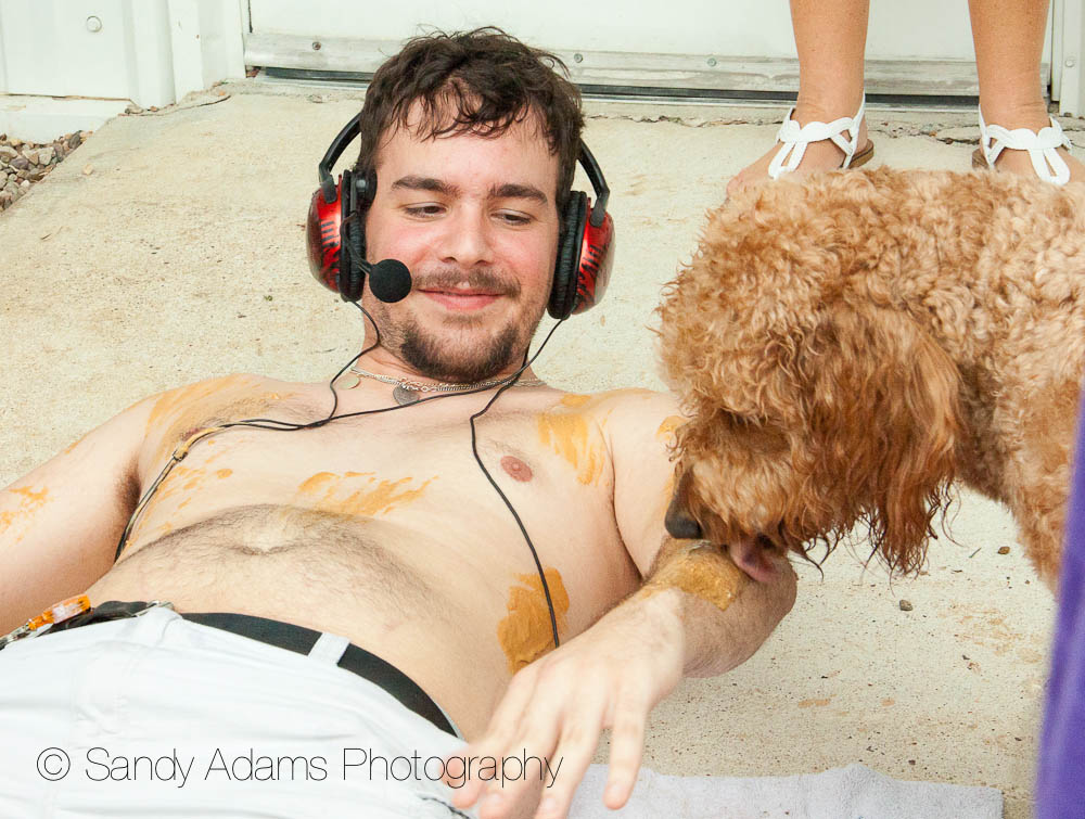 Yesterday morning, The Pet Palace here in Houston received a call and at first they thought surely it must be a prank. Someone wanted to smear peanut butter on themselves and let the dogs lick it off. Seriously?! But it was no prank or at least not a prank on The Pet Palace. Houston FM 107.5 the Dean & Rog show wanted to stage and broadcast their “Torture Tuesday” at The Pet Palace! So early this morning with the dogs all worked up, the rain drops coming down and the peanut butter slathered on radio producer Mark, Darrell Bivens (owner, The Pet Palace) let loose the hungry hounds.