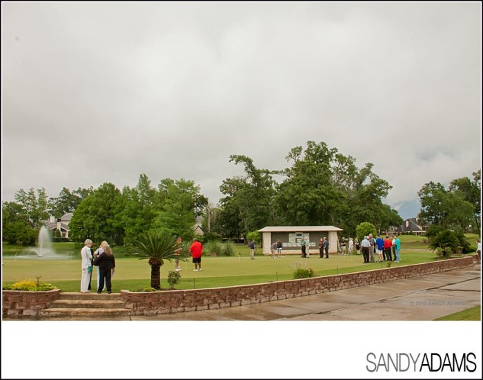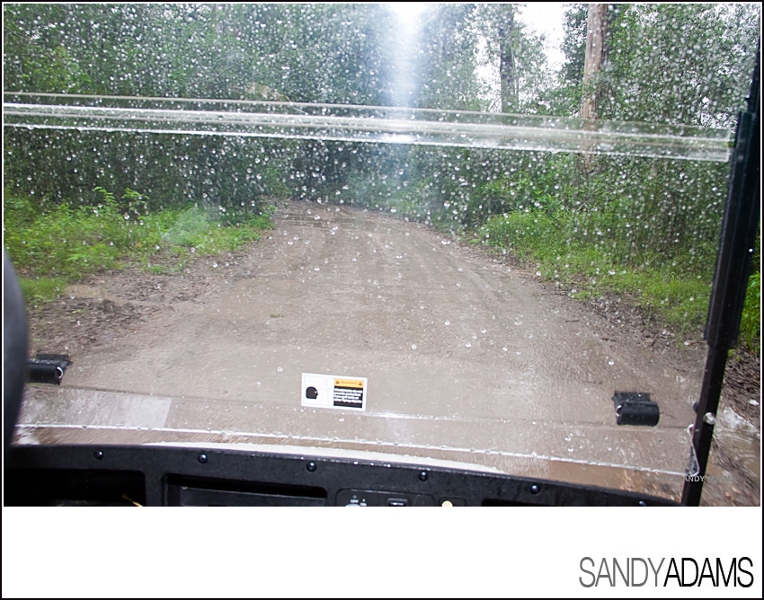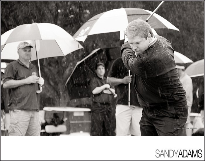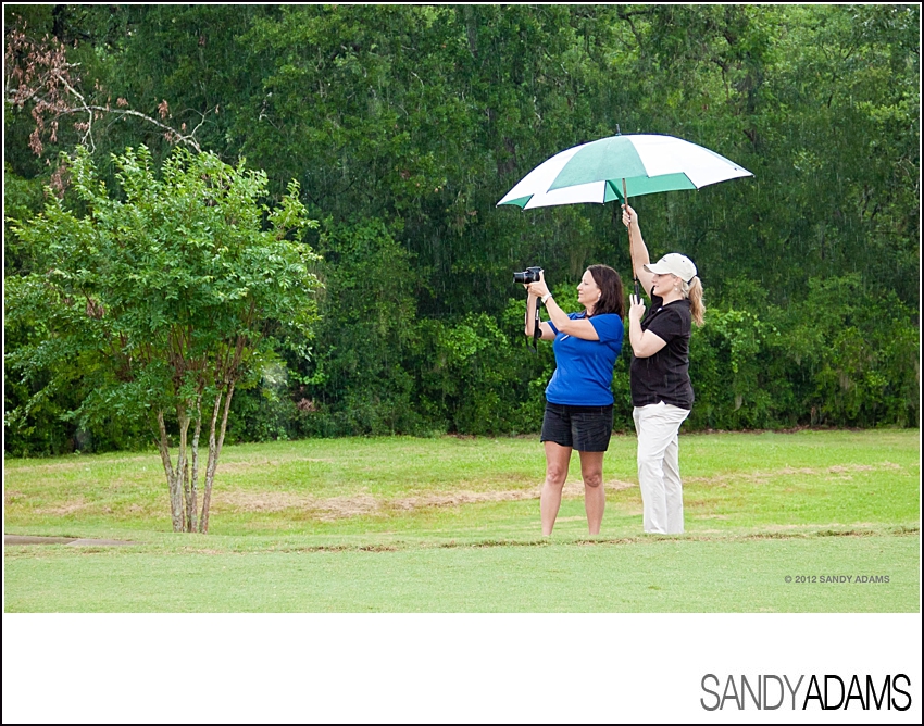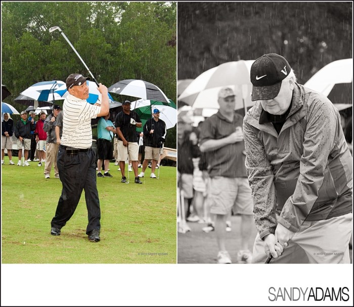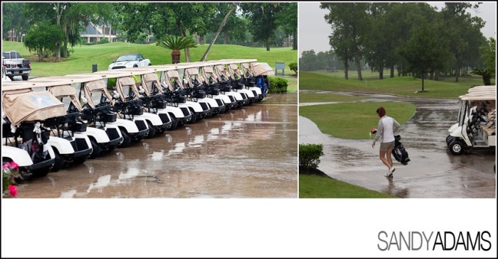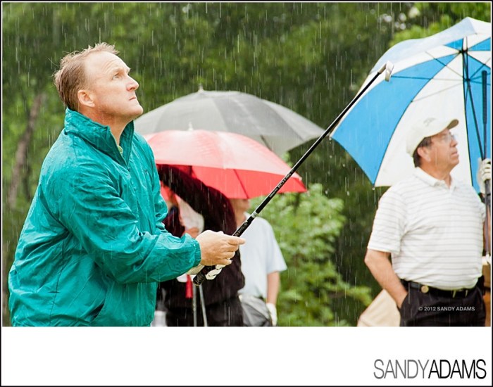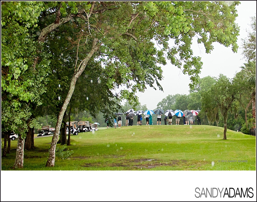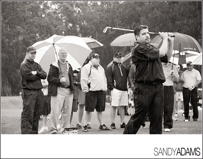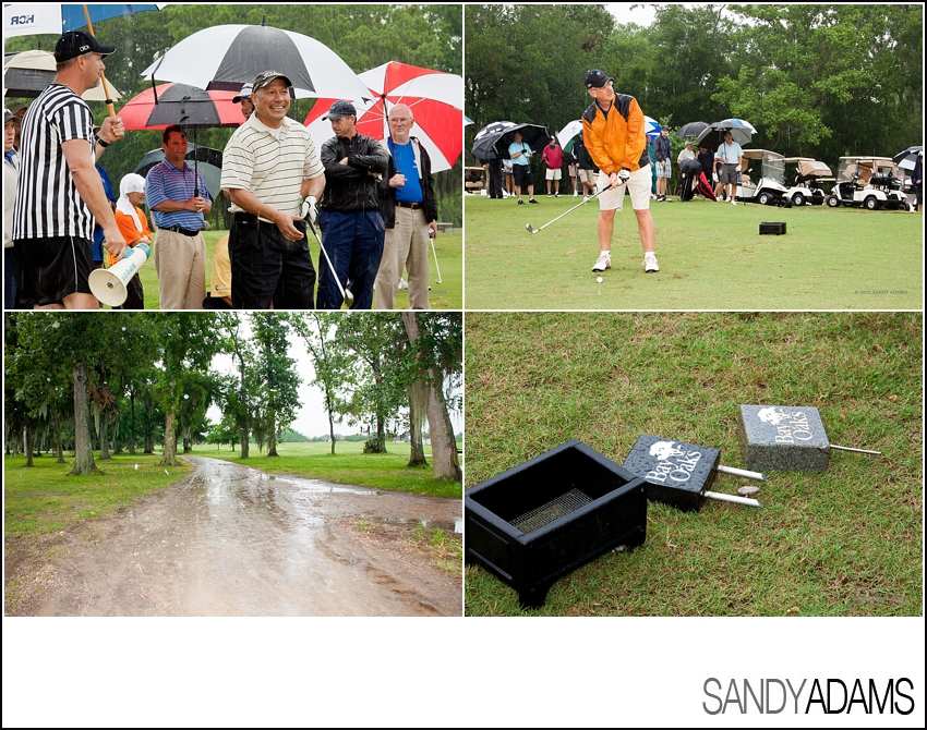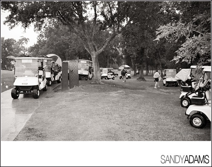 Finally the powers that be decided it was safe enough to have a contest on hole 14 for $1000 cash prize. Everyone grabbed a huge umbrella that looked like a giant lollipop and a golf cart and off they went. The course was soggy and mud spots already forming. We whipped along the path, just like the Dukes of Hazzard. Around the curves we went, finally arriving at hole 14 only to find lots of muddy ruts and still the rain came. Time and time again each golfer got his one chance to see how far he could make that little ball fly. Some came close, still others fell short, but for everyone, the purpose was greater than the prize.