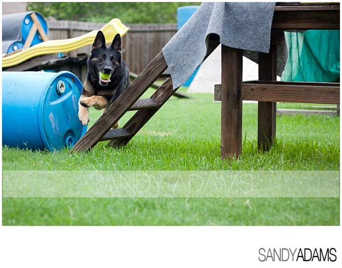 Kathy has two other German Shepherds, Qiefer age 5 and Justice age 6, both males. Qiefer is certified with IPWDA (International Police Working Dog Assoc) in Air Scent and Disaster. Both dogs train with local volunteer search and recovery, Alpha Search and Rescue. Qiefer also competes in Schutzhund. After the little photo shoot with Pascha, Qiefer came out to show off for me. It was amazing to see the strength, speed and agility that this dog possesses. Boy that dog can run!