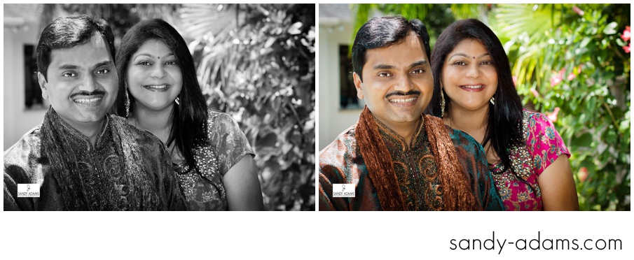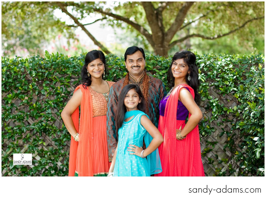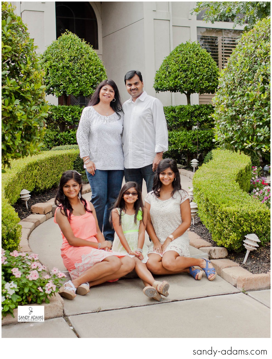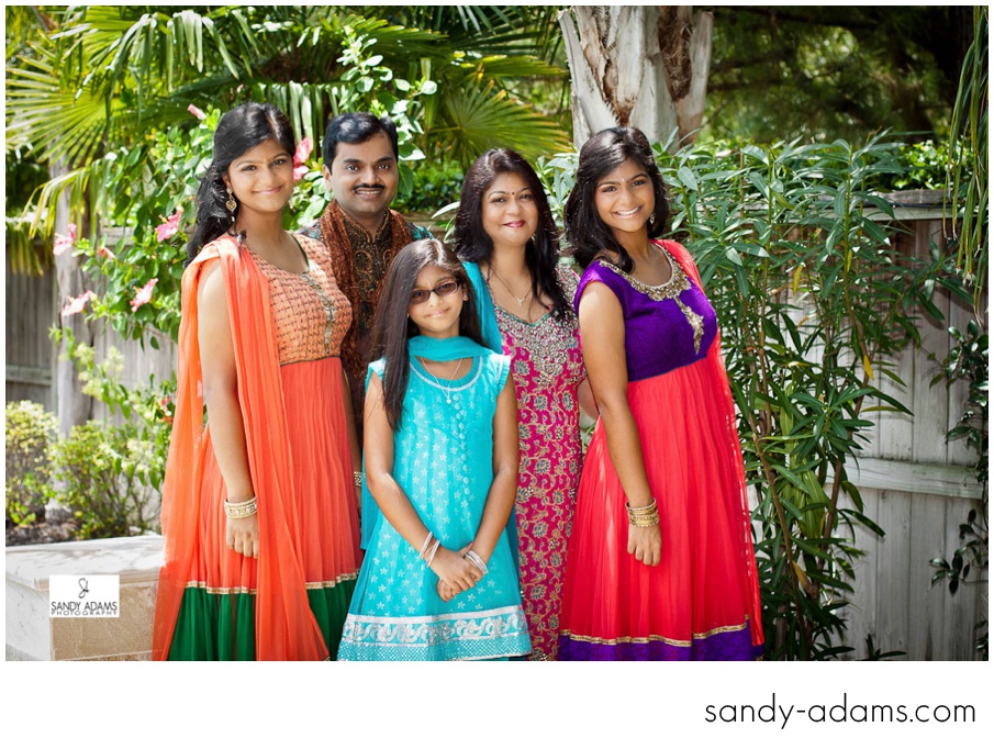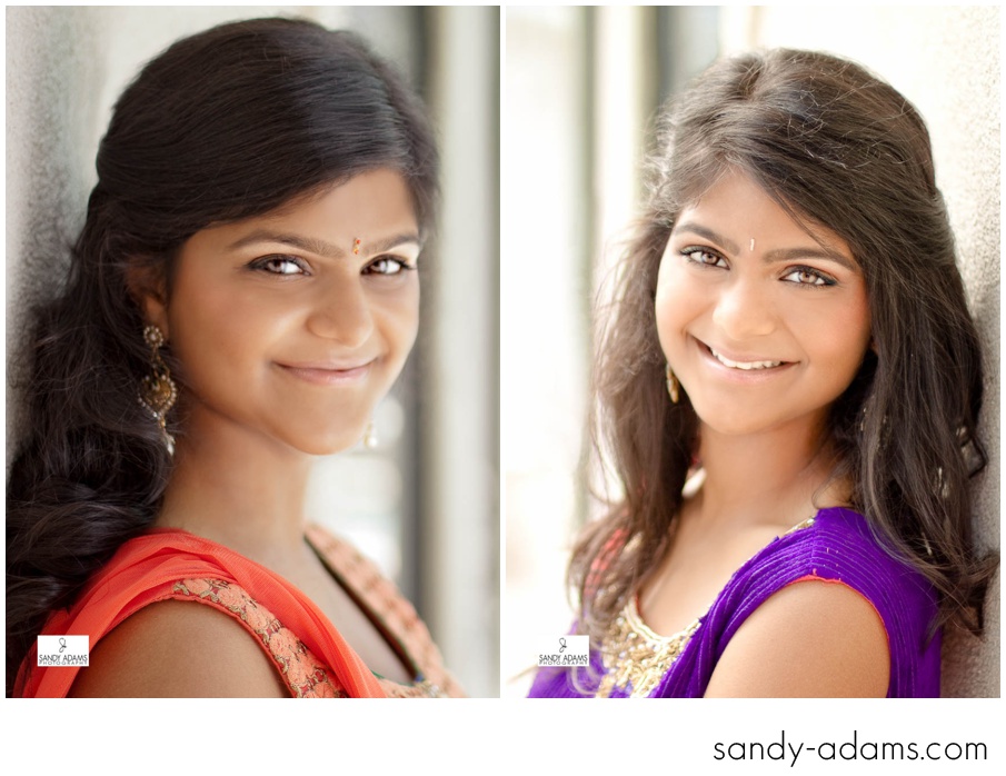 It was a very typical hot and muggy day in Houston Texas… actually very hot! I arrived at the family’s home just as the girls were getting their makeup and hair done. Due to the heat, I had to take the girls out for only a few minutes at a time. You literally started sweating just as you walk out the door! We decided to shoot half the session in traditional clothing and the second half in regular American clothing. From a photographer’s perspective clothing can either make an image or hurt an image, but I knew immediately that the colors of the traditional clothing would knock it out of the park. I used the background of the pool area with the lush vegetation to highlight the clothing.
