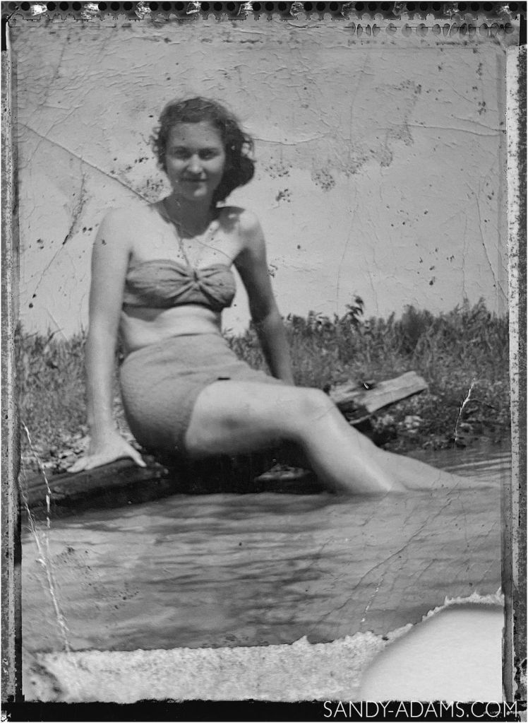 The sun was shining through the window on this cold January morning as I sat on the floor sifting through old photos in a shoebox. I picked up an old black and white photograph that had been been bent several times. It was an image that I had never seen of my mom. From the photograph, she was in her very early twenties and in a bathing suit. And… she was posing for the camera. Wait… what?!